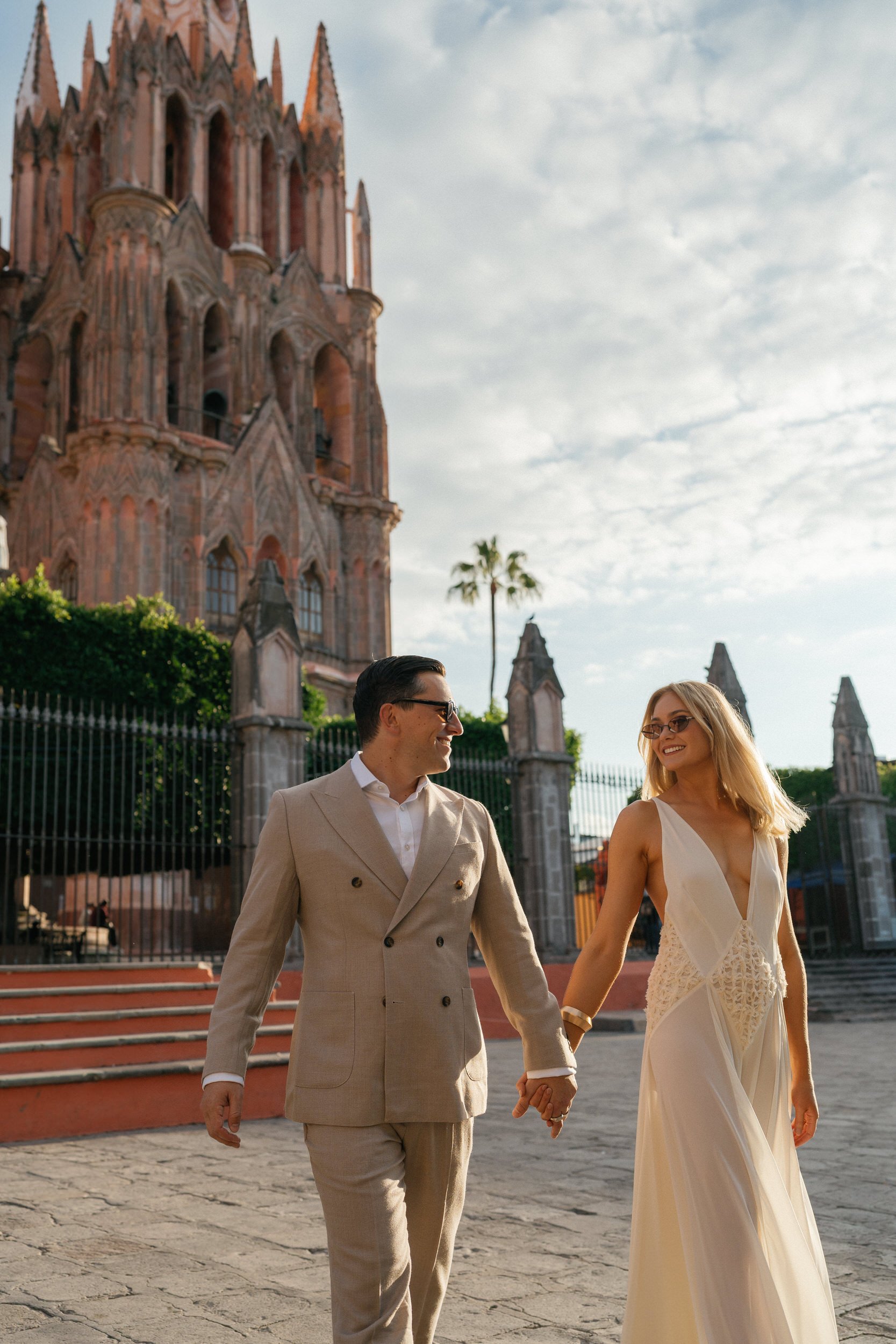 Jacqui & Phill arrived in San Miguel de Allende wrapped in that particular mix of anticipation and wonder that only a destination wedding can create. The evening before their vows unfolded in golden light as we wandered through the historic center—her dress floating through the streets, his jacket effortlessly cool—before gathering friends on a terrace overlooking the city for cocktails, laughter, and a welcome dinner glowing beneath the parish skyline.